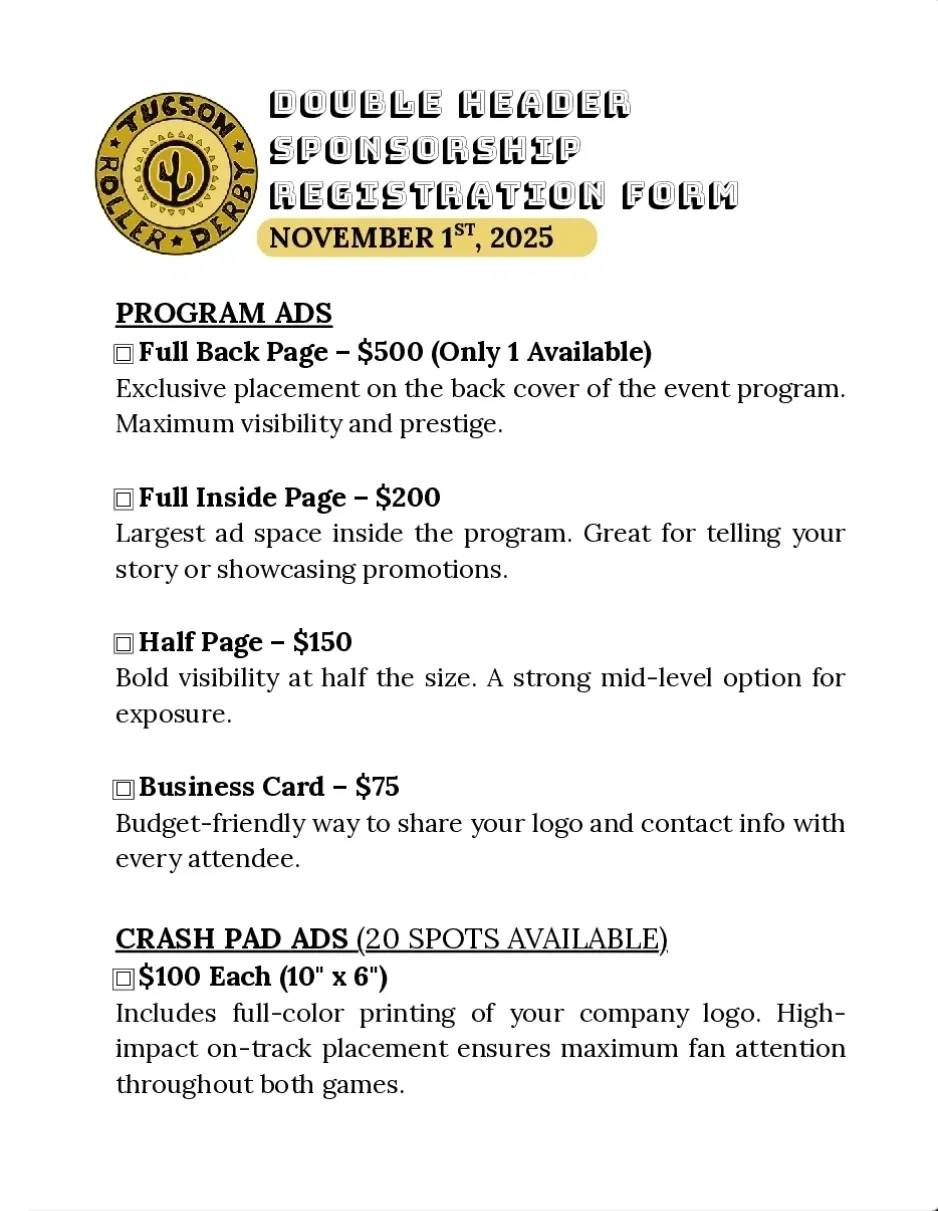 If you're interested in one of our several sponsorship opportunities, please complete the sponsorship form below and send it to info@tucsonrollerderby.org